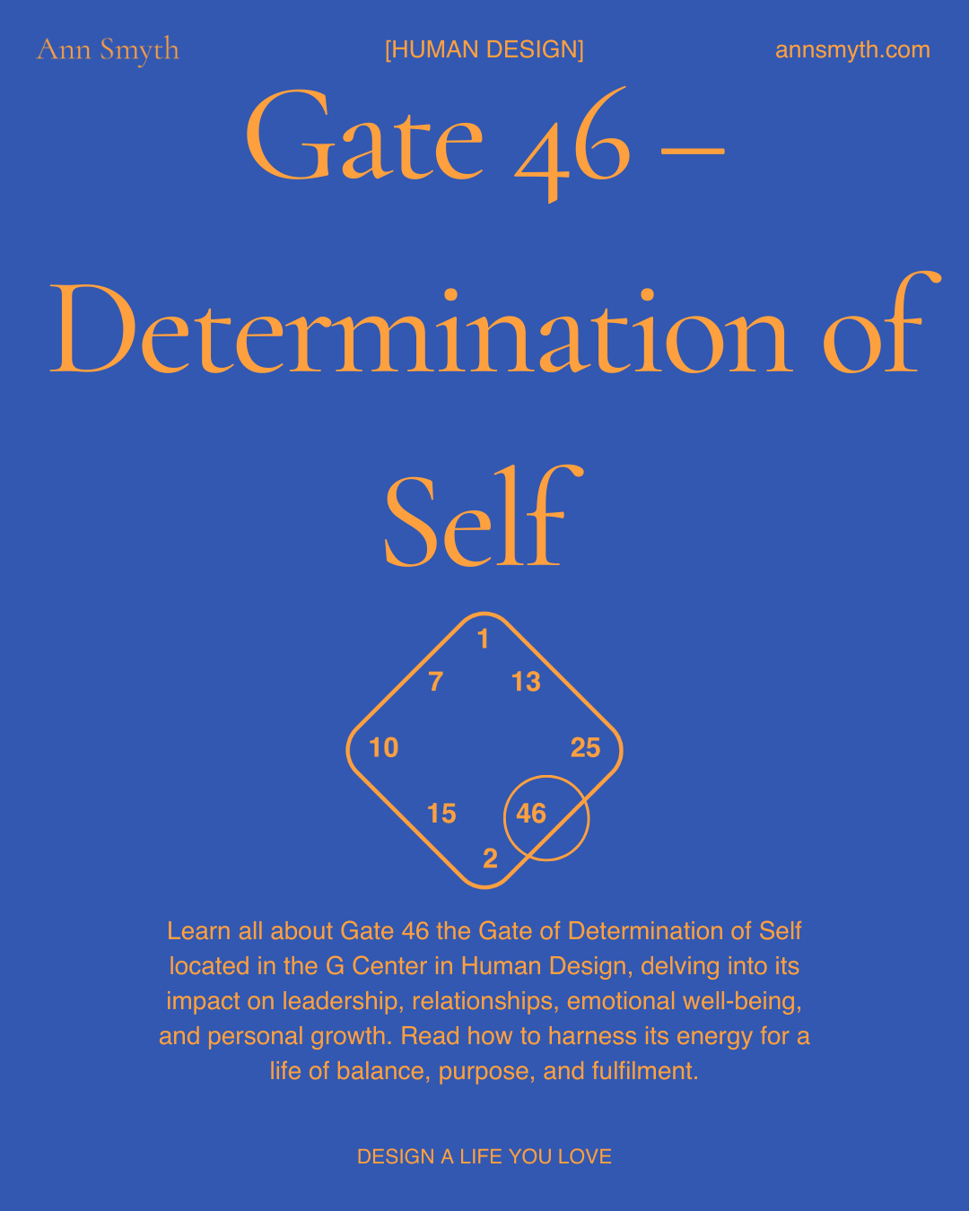 Gate 46, often referred to as the Gate of the Determination of Self, is a powerful and influential aspect of the Human Design System. This gate is located in the G Center of the body graph, a pivotal area that governs love, direction, and identity. The G Center, sometimes called the centre of the self, is crucial in determining how we navigate our life journey and express our unique essence in the world.